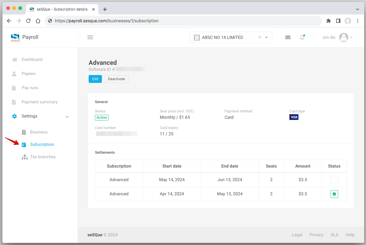 The current subscription details are available on the *Subscription* page in the *Payroll* section: