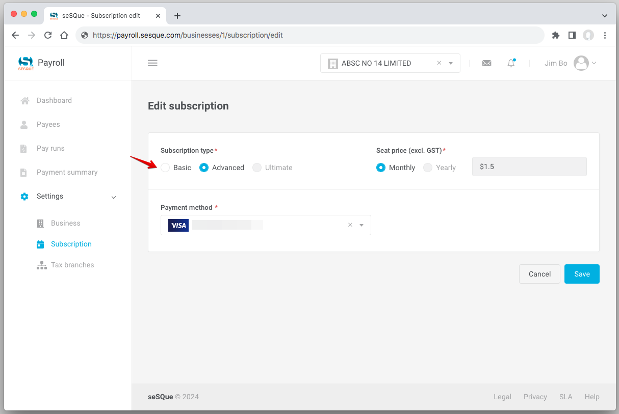 The type of account is selected during the initial setup. Find out more in [setting up payroll](https://docs.sesque.com/getting-started/setting-up-payroll).