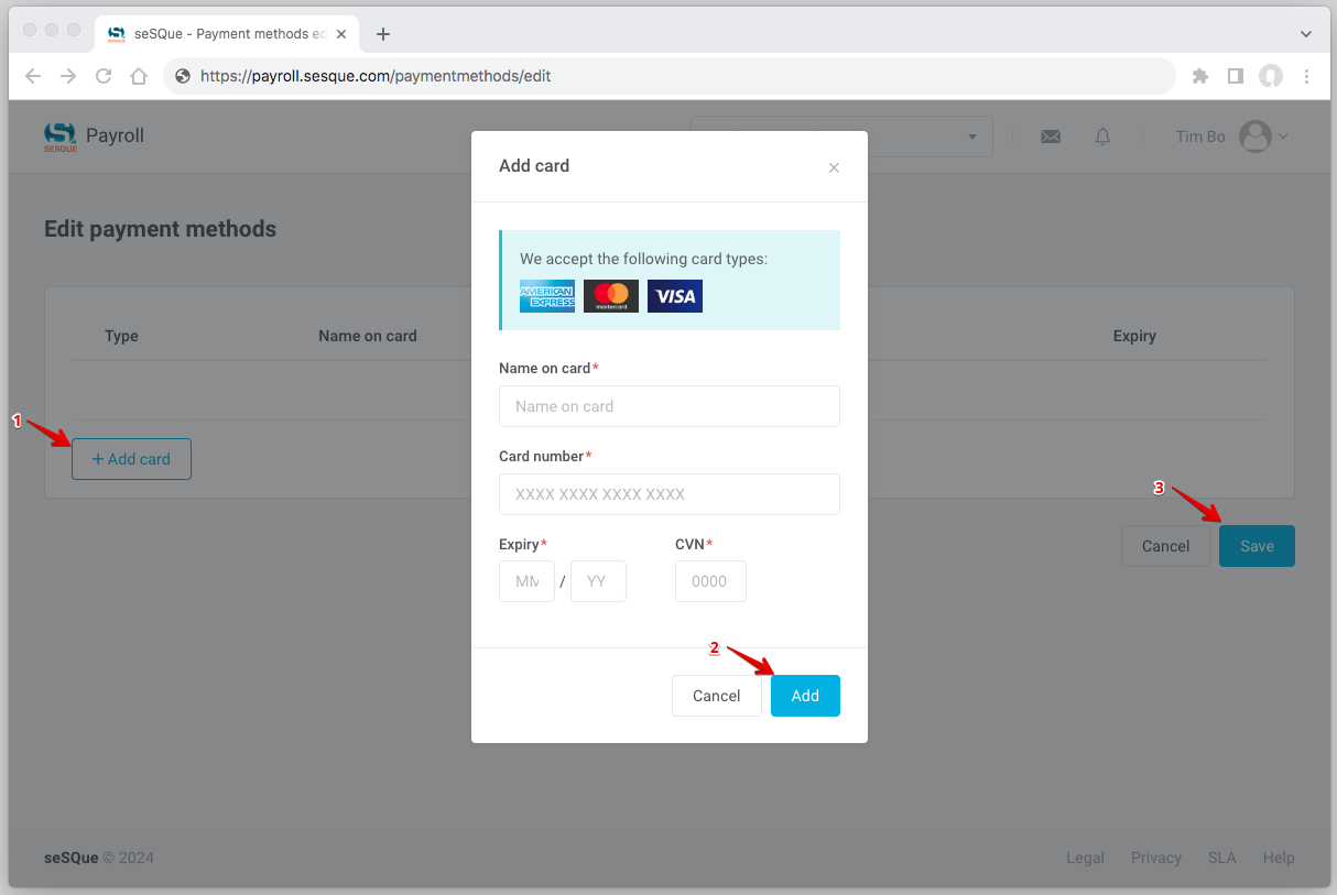 Then click `Add card`,  enter your credit card details and click `Add`, then click `Save` when done: